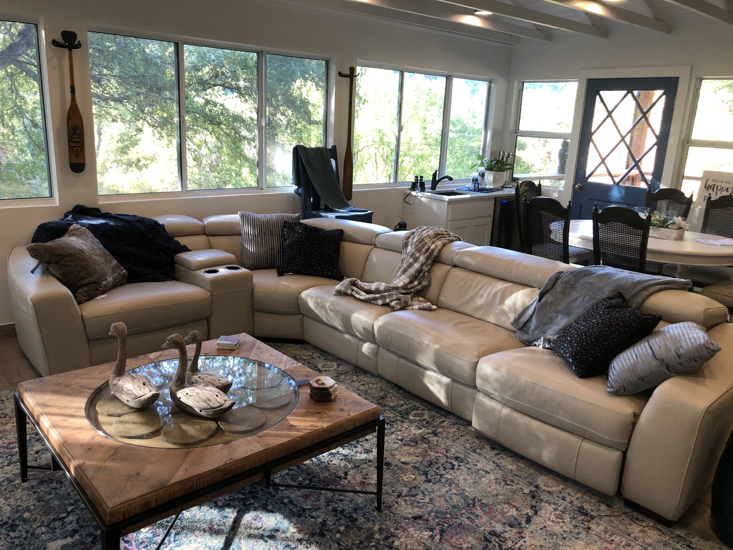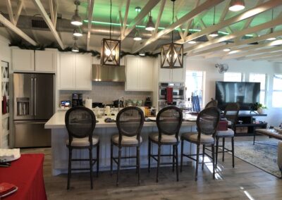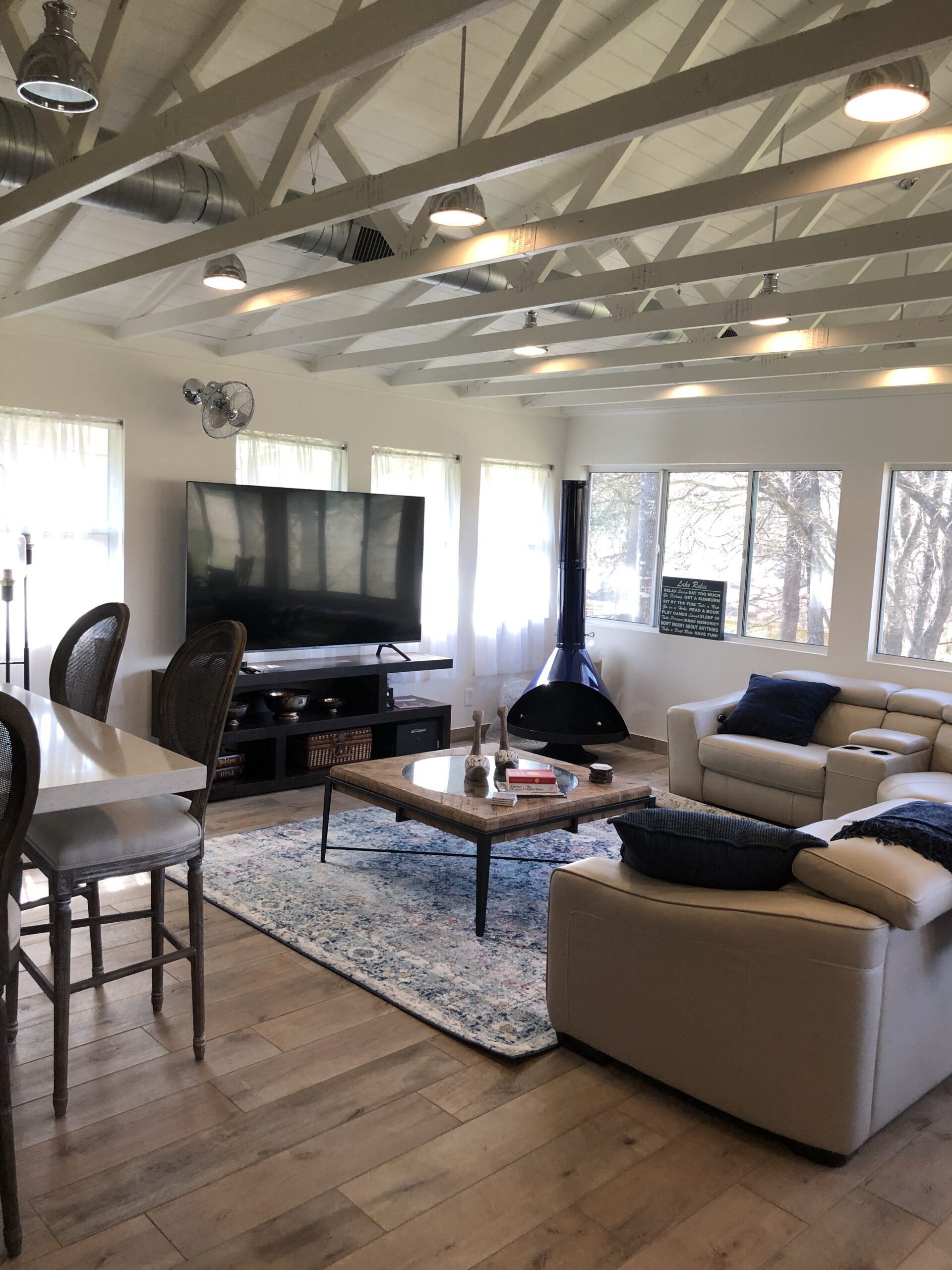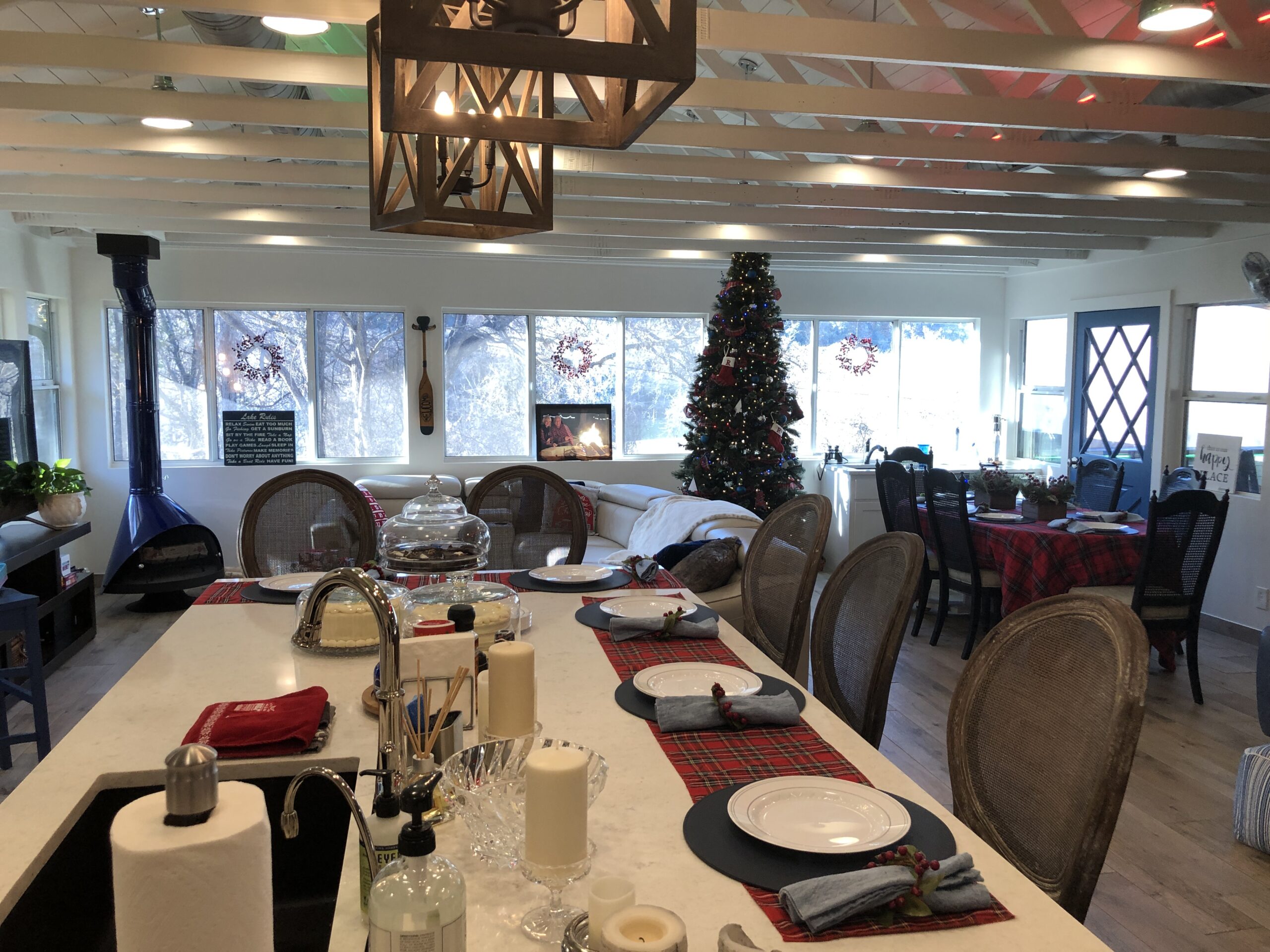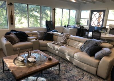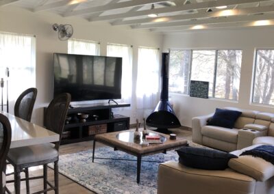 Open floor plan with panoramic lake views from floor-to-ceiling windows. The 1,500 sq ft interior blends classic charm with modern comfort, featuring multiple seating and dining areas. Natural light floods the space, creating an inviting atmosphere for gatherings of any size. Thoughtfully designed for both entertaining and quiet moments of relaxation.